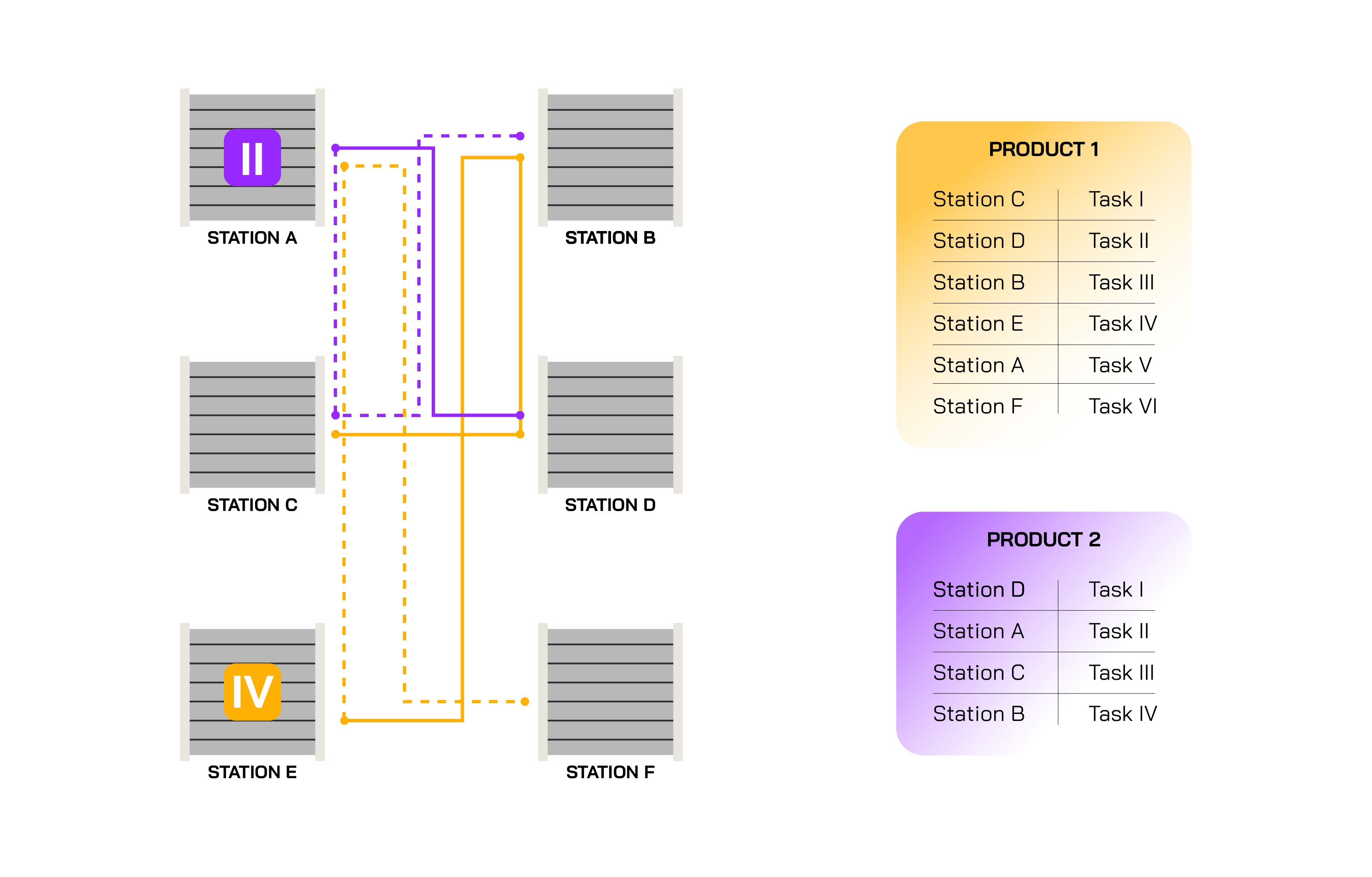 Process flows for each product will have to route parts between stations, while production planning needs to take into account the overlap (the same station might be used for multiple products, so you manage routing and scheduling accordingly)